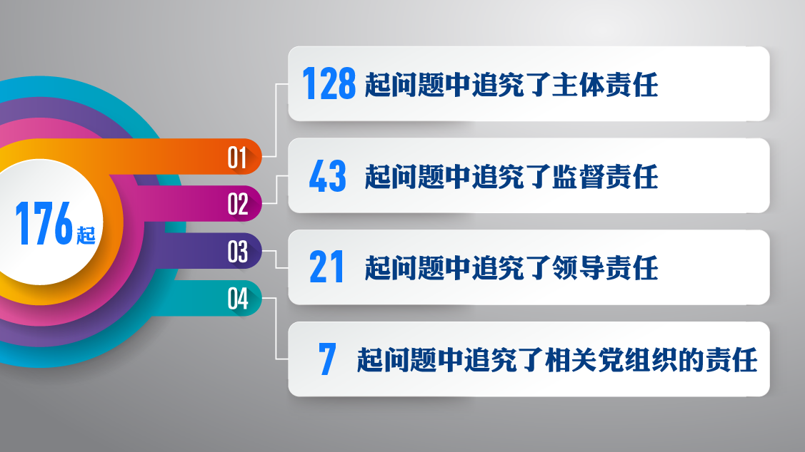 根据问责条例规定,一旦发生失职失责的情况,既追究党的领导干部的责任,又追究党组织的责任;既追究主体责任、监督责任,又追究领导责任。据通报的176起问责典型问题:128起问题中追究了相关人员的主体责任,占总数的73%,体现了抓住主体责任这个“牛鼻子”。同时,43起问题中追究了相关人员的监督责任,21起问题中追究了相关人员的领导责任,7起问题中追究了相关党组织的责任。“问责之网”无处不在,使每个党组织和各级党员领导干部体会到失责必问、问责必严的强烈信号。