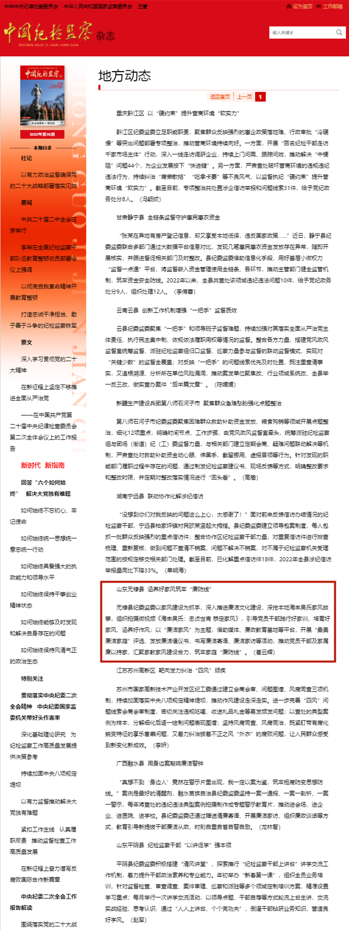 《中国纪检监察》杂志2023年第5期“地方动态”专栏刊发我县以良好家风推进新时代廉洁文化建设经验做法。全文如下: