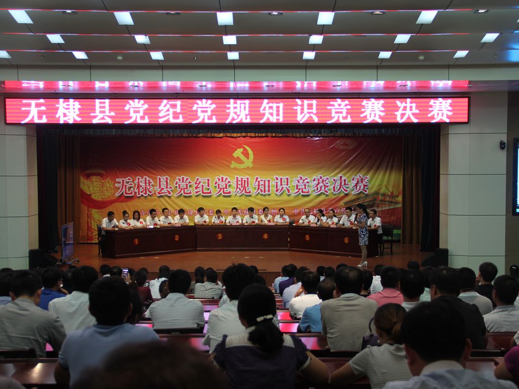 为深入开展“两学一做”学习教育,强化全县广大党员干部的党章党纪党规意识,教育引导党员干部守纪律讲规矩,明底线、知敬畏, 2016年8月31日,由县纪委、县委组织部、县委宣传部联合举办的“无棣县党纪党规知识竞赛决赛”在政务中心第一会议室举行,县委常委、县委宣传部部长、县委统战部部长关莉莉;县委常委、县委组织部部长李宁波;县委常委、县纪委书记任卫国到场观看比赛,并为获奖代表队颁奖。县纪委机关、县委组织部、县委宣传部全体人员;县直部门、企事业单位分管党务工作负责人、纪检组长(纪工委书记);各镇(街)纪(工)委书记、组织委员、宣传委员,共160余人观看比赛。