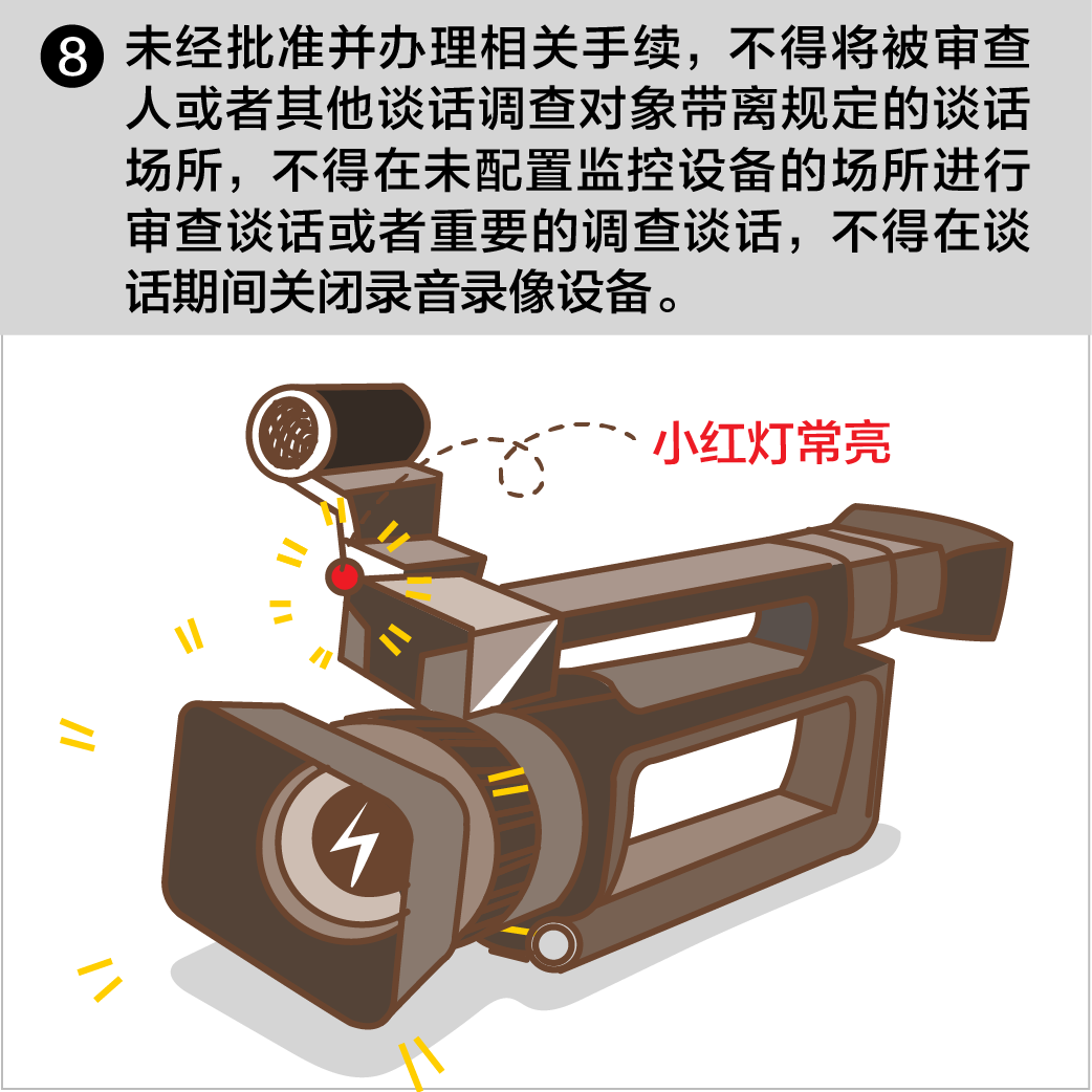 第三十五条 未经批准并办理相关手续,不得将被审查人或者其他谈话调查对象带离规定的谈话场所,不得在未配置监控设备的场所进行审查谈话或者重要的调查谈话,不得在谈话期间关闭录音录像设备。(摘自《中国共产党纪律检查机关监督执纪工作规则(试行)》)