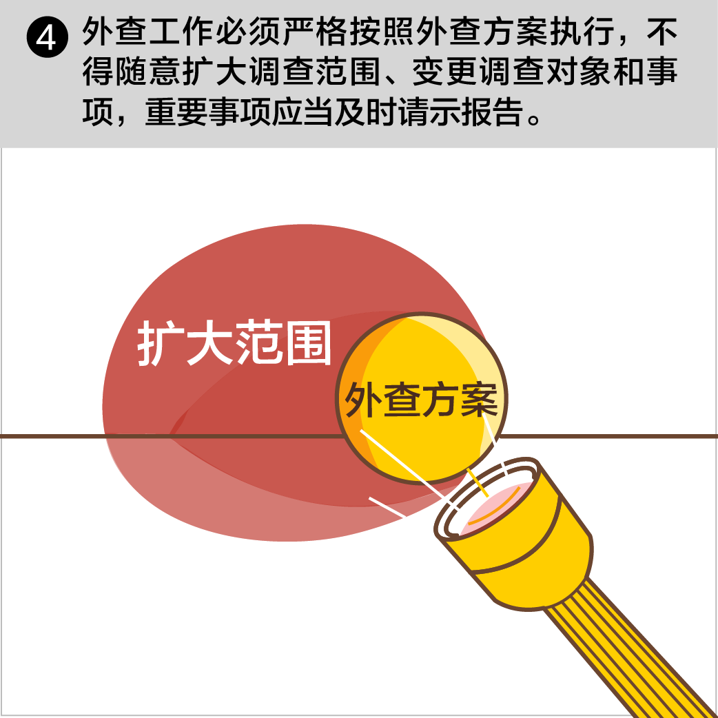 第三十一条 外查工作必须严格按照外查方案执行,不得随意扩大调查范围、变更调查对象和事项,重要事项应当及时请示报告。