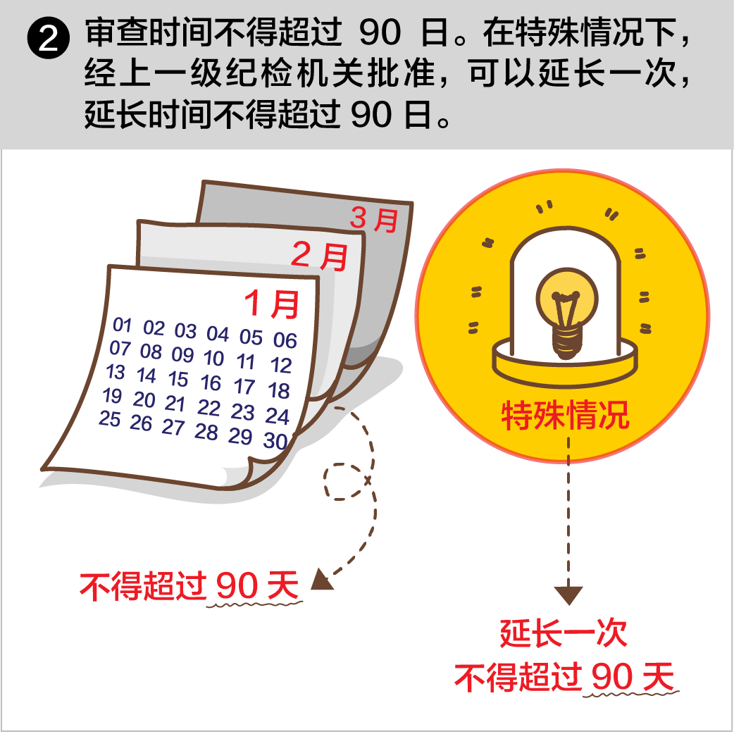 审查时间不得超过90日。在特殊情况下,经上一级纪检机关批准,可以延长一次,延长时间不得超过90日。