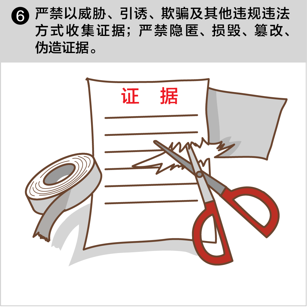 严禁以威胁、引诱、欺骗及其他违规违法方式收集证据;严禁隐匿、损毁、篡改、伪造证据。