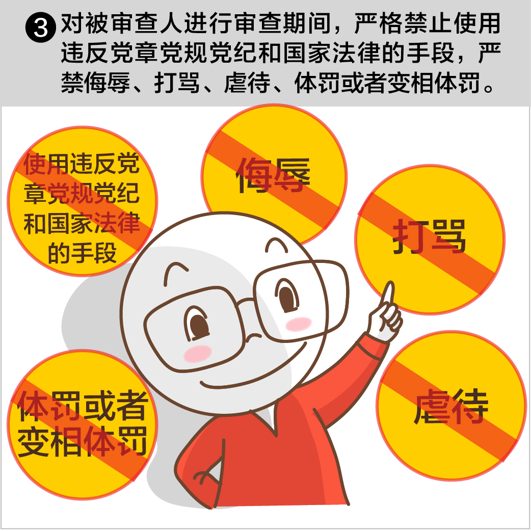 审查应当充分听取被审查人陈述,保障其饮食、休息,提供医疗服务。严格禁止使用违反党章党规党纪和国家法律的手段,严禁侮辱、打骂、虐待、体罚或者变相体罚。
